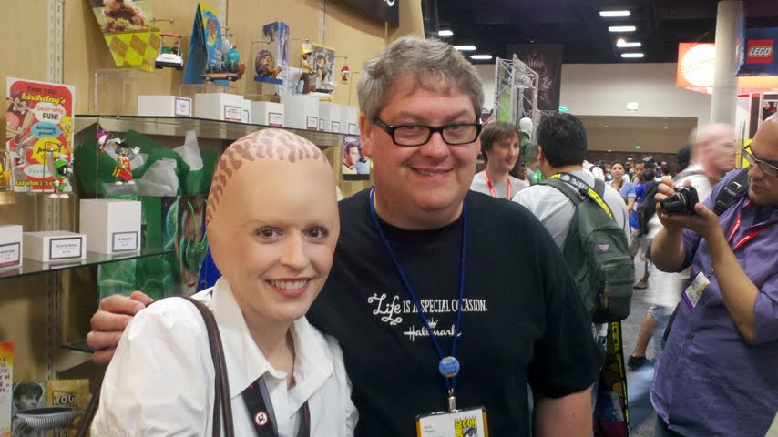 Day Two of the San Diego Comic-Con proved to be non-stop fun. You can’t get the full comic convention experience without at least one day in costume so at borg.com that day was today. Elizabeth C. Bunce and I took to the floor as Tenctonese visitors from Alien Nation who happen to work at the local Buy More, including Elizabeth as a member of the Nerd Herd from the TV series Chuck (with screen-used prosthetic heads from the series courtesy of Prop Store of London, also at the Con). Our favorite costumes are the most obscure and we got about 1,000 fans and press stopping us for photos, several saying we had the most creative costumes of the day and interviews by four TV stations including G4.