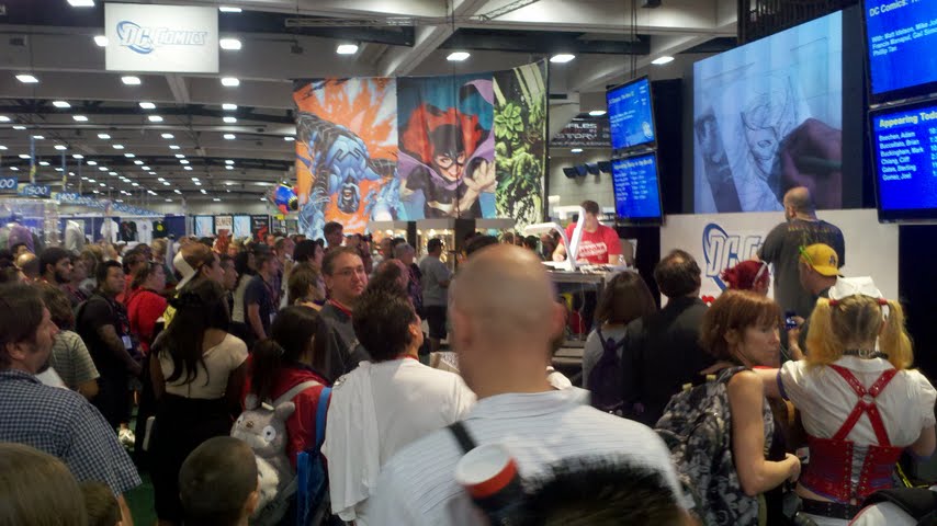 DC Comics had another great area at the San Diego Comic-Con International this year. DC seemed to be THE merchandising property of the 2011 event with its focus on the 52 #1 comic titles debuting in September. Jim Lee’s cover to Justice League #1 was literally everywhere you looked. The League was the picture on the choice swag bag, for sale on T-shirts at the DC Comics Graffix sales booth, and featured on the cover of the convention souvenir book. Jim Lee was on panel after panel and seemed to be royalty at this year’s event.