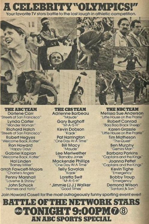One of the best parts of the Battles were the networks’ coaches who served to anchor the teams and cheer on the sometimes athletically-challenged participants. The first captains were Gabe Kaplan, Robert Conrad and Telly Savalas. William Shatner and Tom Selleck would later serve as popular captains, among others.