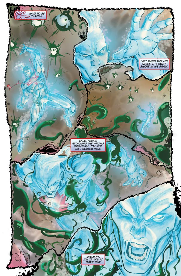 Williams’ illustrations are refreshingly unique in the New 52. He varies his styles and drawing and painting techniques in way I have not seen anywhere else. He doesn’t just draw panels like he is getting directions from a script and plodding ahead. The pages are nicely balanced, employing what reminds me for lack of a better phrase as “special effects”–bubbling imagery of dematerializing hands, edges that are almost undefinable for Captain Atom himself to give the feel of heat and energy, panel borders that converge in a way similar to what J.H. Williams is doing on his Batwoman series. And kudos to Jose Villarrubia for his coloring, which really draws out Williams creative effects and highlights Captain Atom in particular.