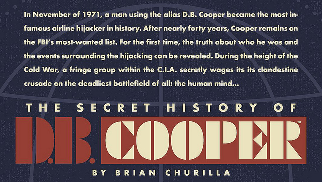 Second, Churilla picked a great hook using D.B. Cooper as his hero. In more than 40 years he is still thought of not like every other airplane hijacker of all time, but is constantly referred to as “an American folk hero,” achieving something of a mythic status like Jesse James and Bonnie and Clyde. The FBI has investigated over 1,000 suspects over the years, documented several deathbed confessions, a movie, The Pursuit of D.B. Cooper starring Treat Williams, and several non-fiction books. Yet, Cooper has hardly been used as the subject of a good, creative retelling.