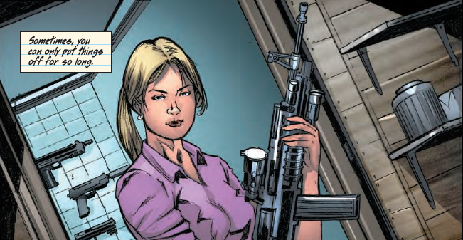 Issue #1 is first and foremost a prologue. And only toward the end of the issue does she take action, a bit like the DC Comics New 52’s Batgirl in her first hand-to-hand combat. She falls into a bad situation, but comes out barely bruised. She learns something about her five uncles that will help her to kill them all off and avenge her father’s death. All in a day’s work for someone like Fiona on Burn Notice, Annie on Covert Affairs, even Echo in Dollhouse, or Jennifer what’s-her-name, who humorously questions upfront if any soccer mom-type turned murderess gets to create with her own nickname.