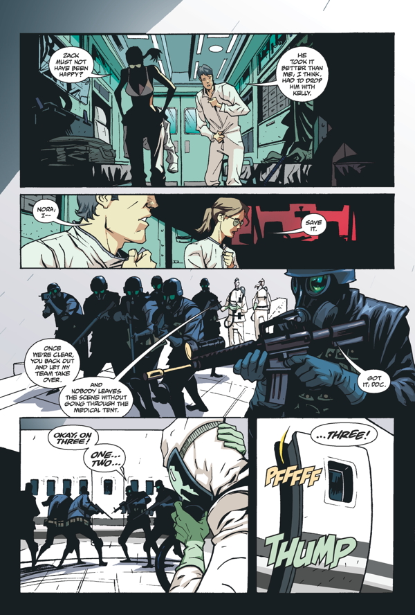 In this volume adapting del Toro and Hogan’s work, David Lapham’s handling of the story is pretty riveting, even the transition from a story about a terrorist virus to a contagion caused by an organism that creates blood-seeking vampires–moving us from what could have been a real-life story to one of fantasy–is done successfully here. What really sets the tone and drives the story forward is Mike Huddleston’s art, and specifically his way of taking explanatory dialogue between characters and having the imagery remain compelling–not just a talking heads story like you might find were this a TV series. And having recognizable characters and believable locations so that the reader doesn’t get bogged down in the telling of the story makes this effort evocative of another successful zombie work–the scary and brilliant film 28 Days Later. I’ve liked Huddleston’s work before, but this may be a breakout project for him, or at least another great addition to his portfolio. Again, I think his interiors triumph over E.M. Gist’s horror cover art. (I am sure Gist’s richly painted work has a great appeal to horror fans, but for more of a mainstream crossover genre reader like me it’s just not my thing). Colorist Dan Jackson deserves credit for his muted tones, which give a great creepy vibe to this novel.