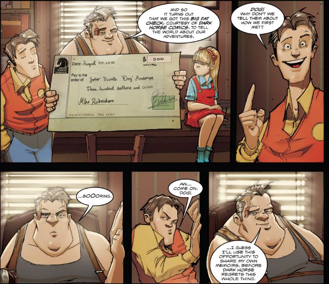 In theater if an actor breaks character and begins speaking directly to the audience it is referred to as breaking the third wall. If the character acknowledges that it is a fictional character in a fictional story, it is breaking the fourth wall. In Dark Horse Comics’ new one-shot The Untold Tales of Dog Mendonça and PizzaBoy, writer Felipe Melo and artist Juan Cavia provide a textbook example of how to break both walls just right.
