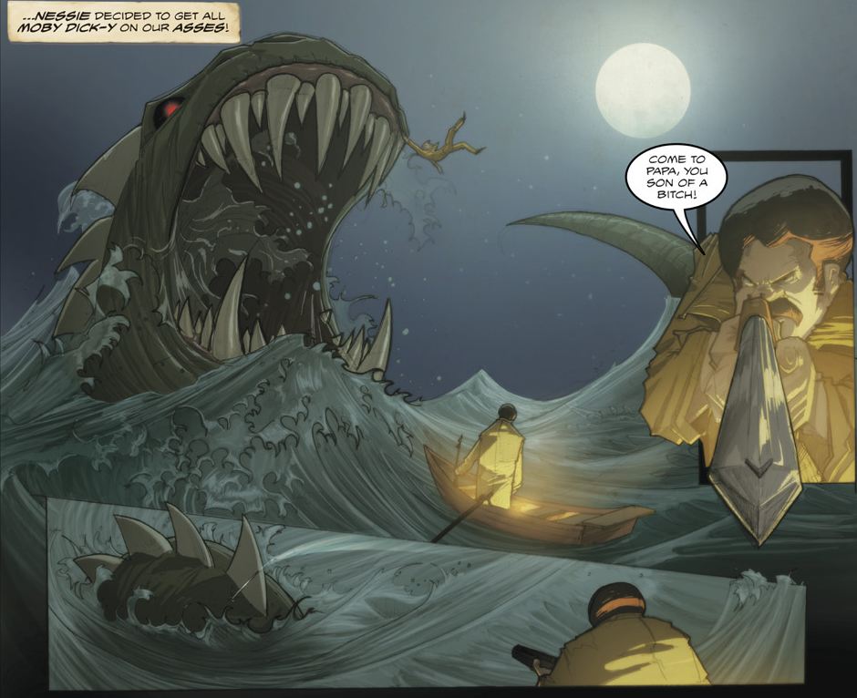 As bizarre as this all these elements may appear, the execution is seamless. Portuguese writer/musician Melo and Argentinian artist and set designer Cavia (and colorist Santiago R. Villa) provide a laugh-out-loud level of storytelling along with incredible looking characters and setting. And for fun they pile on Nazis as the villains and even go to Scotland to meet up with a mean Nessie, the Loch Ness Monster. Underlying the craziness is an almost sweet story of a poor kid like Dark Horse’s flagship character Hellboy who once upon a time got stuck in all the wrong circumstances simply because of an old Portuguese curse–legend has it that the male sibling of six sisters is born with a terrible curse… the curse of the werewolf. Soon Dog Mendonça finds he is not the only ex-carnival sight around, and ends up with a group of others, including an invisible man. It’s all set up to be an ongoing series that I’d love to get my hands on if it pans out.