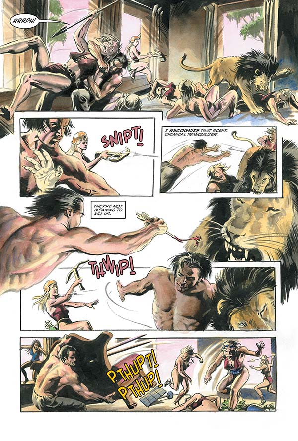 In a story that sometimes presents curious encounters and interesting action conflicts, it also seems to be more about examinations of time and place than a cohesive, plot driven narrative. Writer Alan Gordon’s three-part serial, originally part of the Dark Horse Presents anthology series, could stand to be expanded so that Gordon can spend more time explaining what is happening and less time showing images that leave the reader guessing. What we see are snippets of an interesting character, but what is missing is where we are and how we got there. Only through marketing can we tell he is in future, post-apocalyptic London, for example. Yet, this Tarzan has a cool vibe all his own. Artist Thomas Yeates, known for his renderings of both Prince Valiant and Conan, rounds out the classic comic book fantasy trilogy with this Tarzan story arc. Yeates’ color work stands out the most in its subtlety.