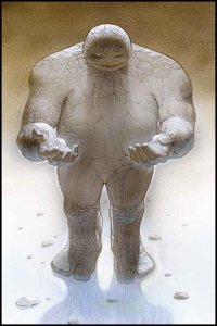 Before I get to this question, as I wanted to move on quite quickly in my writing about it, I need to explain how the question connects with “Depths.” In this opening trade paperback, Chadwick slowly reveals the origin of his hero, Concrete. Aliens capture speechwriter Ronald Lithgow and transplant all of his memories into a large, agile, powerful, hardened stone body that does not need the air, water and food that his human body needed. In this body, he can’t be the speechwriter that he trained to be, but the world opens up to him in a different way. Suddenly he can be the adventurer of the serials, novels and non-fiction he read as a child, stories where heroes save the day everywhere from the far corners of the Earth to far away planets and galaxies. He decides to change the course of his life and become his version of those adventurers, digging below ground to save miners, trying to swim the Atlantic Ocean, serving as a bodyguard for a rock star and studying giant rays in the Pacific.