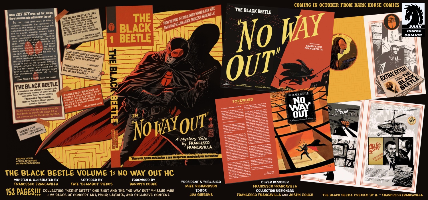 Nailing down what is best about Francesco Francavilla’s comic book craft is a bit difficult. His five-part, creator-owned series The Black Beetle, Volume 1: No Way Out is now available in a lavish, exquisitely designed hardcover edition, and it is his best work to date, which says a lot considering he won his Eisner for his great 2012 cover art on Black Panther, Lone Ranger, Lone Ranger/Zorro, Dark Shadows, Warlord of Mars, and Archie Meets Kiss, AND his current Afterlife with Archie artwork may ultimately even rival his Black Beetle.