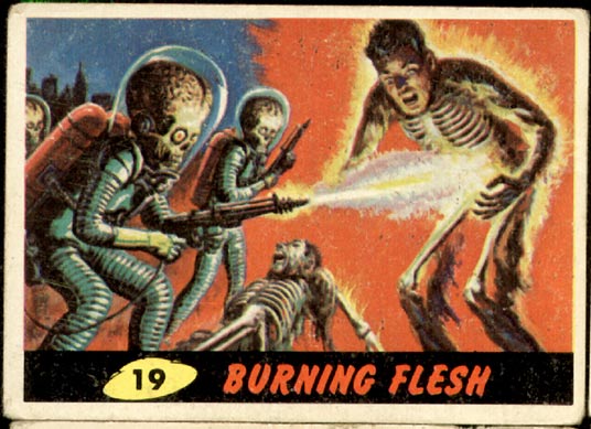 It’s not likely that many people actually got their hands on the 1962 of Topps trading cards, as explained in Mars Attacks 50th Anniversary Collection, the latest in Abrams Comicarts’ series of bubble gum-inspired books including Star Trek: The Original Topps Trading Card Series, and Bazooka Joe and His Gang 60th Anniversary Collection, both reviewed previously here at borg.com. The original Topps card set was not well-received by parents and teachers because of its graphic depictions of burning bodies, exploding, mutilated, and sliced-up people and animals by the vile Martian invaders. So the card set had a limited run. The result is a collectible that would cost you $25,000 in order to acquire a complete card set. Which makes this new book a great way to see what we missed.