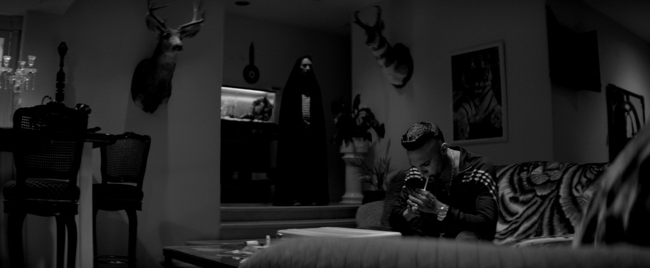 Early in the film, the co-protagonist girl vampire decides to go home with a drug dealer who had previously threatened the other protagonist as well as a local streetwalker. As he bursts into his lair, he walks by a large fish tank and gives it a smack. Seconds later he’s doing lines of cocaine on a glass table, a mounted deer head and a mounted antelope head on the wall behind him, before turning on the annoying techno. He sits on a couch draped with a blanket of what looks like tigers that would jump out under black light. In the corner there is a hookah. As the girl vampire explores the rest of the pad, she finds a set of drums just below a large marijuana leaf poster. I laughed to myself as I immediately realized I had in those brief seconds already characterized this asshole in my mind with no redeeming qualities. Sure, the actions earlier helped, but that apartment spoke to me clearly and it screamed into my brain “HE IS A DOUCHEBRO.”