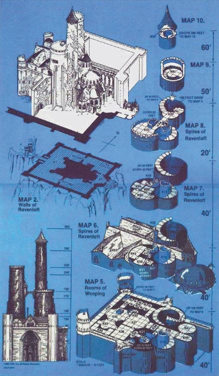 Then along came Tracy Hickman (of Dragonlance, Darksword Trilogy and Death Gate Cycle fame) and he had the audacity to think “Why are these monsters here? Why are they trying to defeat us? What’s their story?” Tracy and his wife Laura came up with Count Strahd von Zarovich, a tragic but thoroughly evil and menacing figure modeled after the original vampires of Bram Stoker’s Dracula novel and Nosferatu of early cinema. Then they wrapped an immersive story around this figure, with NPCs (non-player characters, for the uninitiated), locations and lesser foes who made sense, who thoroughly belonged in the adventure and had more depth than a set of statistics to be overcome by the power-hungry party of adventurers. To top it off, they added a groundbreaking 3D map (shown below) and guidelines for adding an ambience to the story that no other adventure had ever provided before.