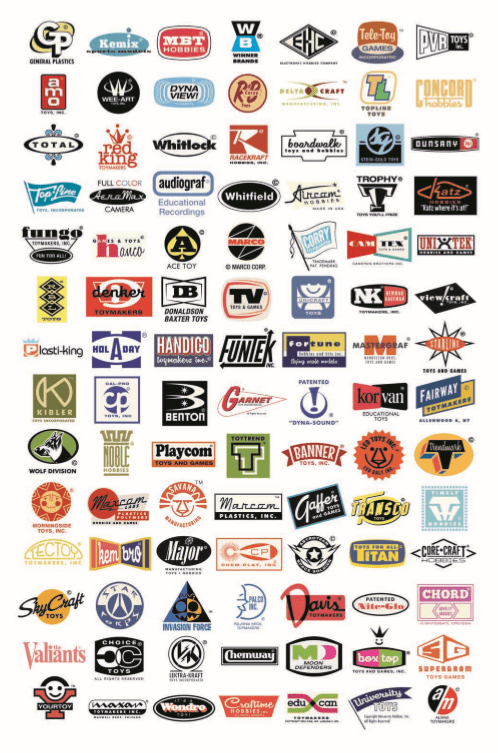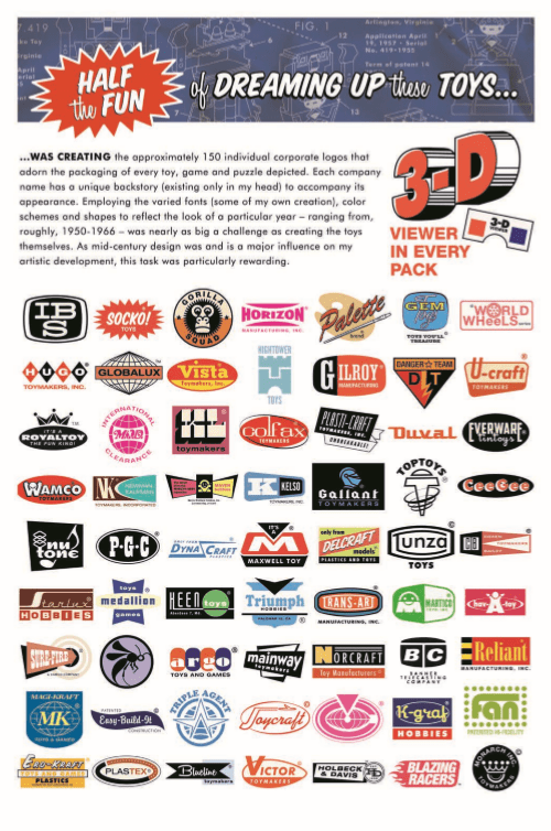 Ads for 33 1/3 LP records, paint sets, doll accessories, toy jewelry, cap guns, spy toys, snacks, Western toys, and games are all here, too. Half of the fun is sleuthing out the real toys, games, and brands that inspired Baumann’s logos and concepts. Plus Baumann notes that each toy concept and logo have their own past that only he knows. The details of the hundreds of new logos are fascinating to marvel over. He’s also provided the added touch of weathering each ad, folding some as if they were in a kid’s pocket. Each could very well be the real thing in a parallel America of the past.