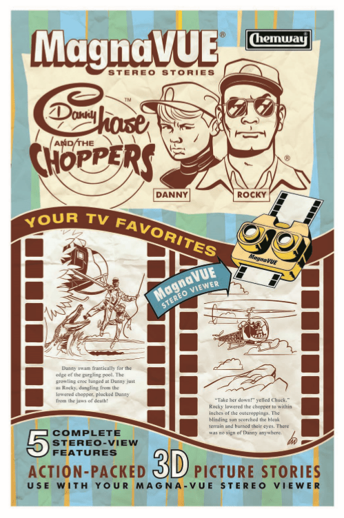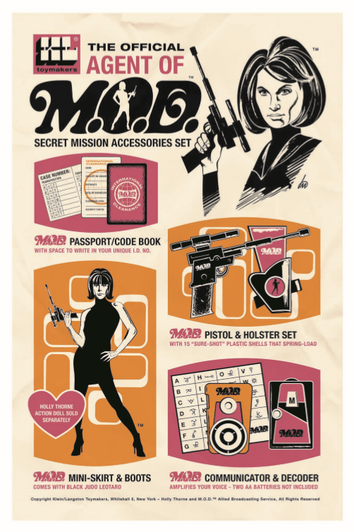 You’ll see ads that might have been created for View Master or Ben Cooper Halloween costumes, designs for toys that could have been Marx Toys action figures, G.I. Joes, Barbie dolls, Guillows balsa model kits, and those cheap plastic toys you could only order from the tiny ads in comic books. The commonality is the bright, loud, color palette of the era, plus trading cards, battery-operated gadgets, and anything you can display in 3D. And much of the reflection in design is not secretive but obvious, like an ad for a codebook for The Man Called… C.O.U.S.I.N. You remember that classic series, right? Of course you do.